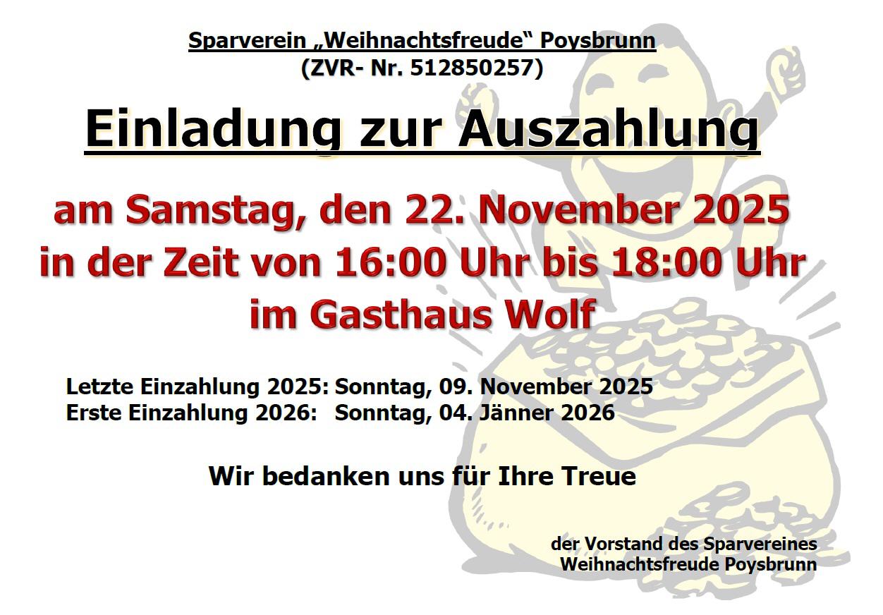 Die Auszahlung findet am Samstag, den 22. November 2025 in der Zeit von 16:00 bis 18:00 Uhr im Gasthaus Wolf statt !!! Letzte Einzahlung 2025: Sonntag, 9. November 2025 Erste Einzahlung 2026: Sonntag, 4. Jänner 2026 Der Vorstand des Sparvereines "Weihnachtsfreude Poysbrunn"