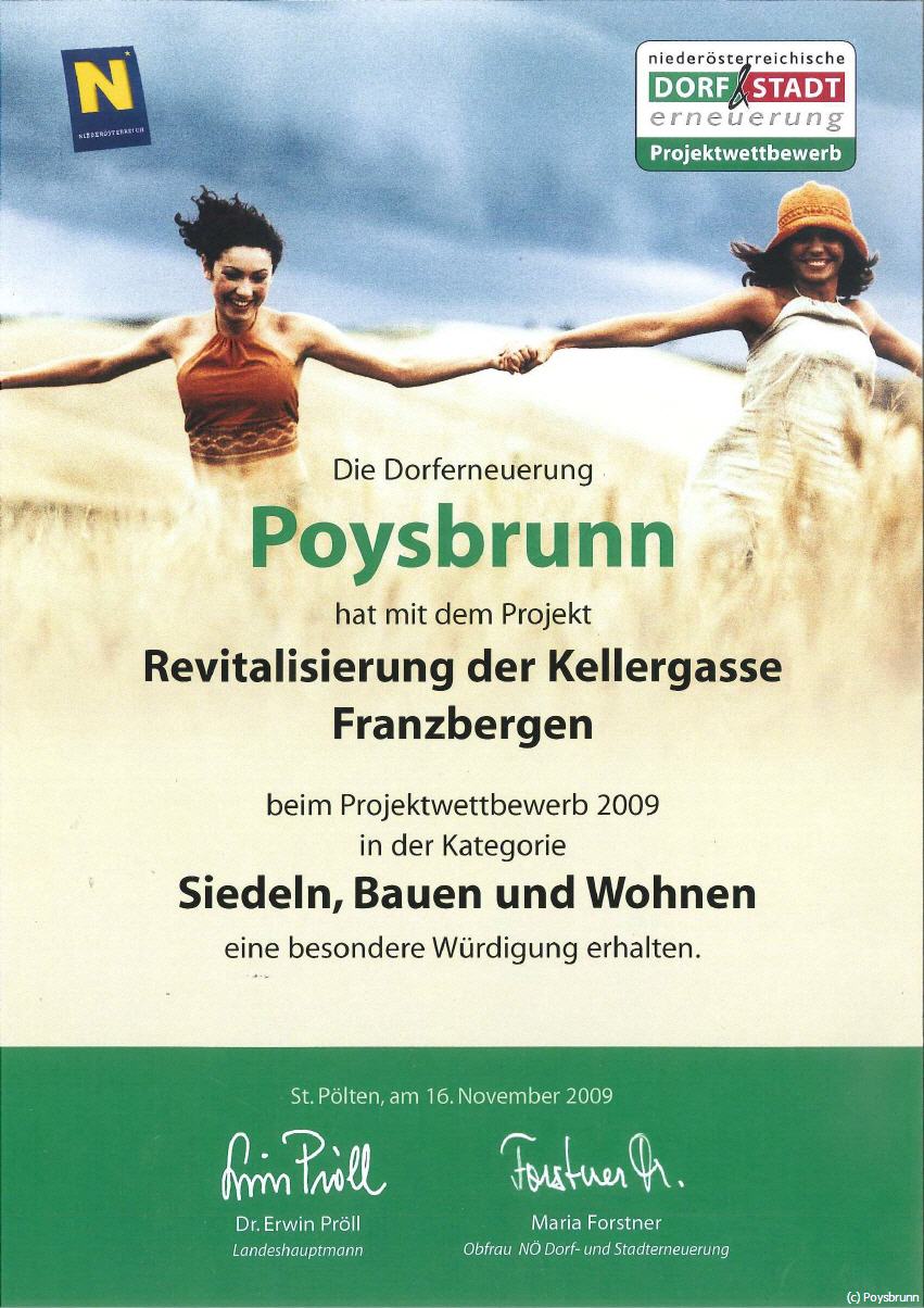 Der Verschönerungs- und Dorferneuerungsverein Poysbrunn ist beim Projektwettbewerb 2009 im Bereich Siedeln, Bauen und Wohnen mit seinem Projekt, der Revitalisierung der Kellergasse Franzbergen, in das Finale der besten vier Projekte gekommen. Es konnte zwar nicht der 1. Preis erzielt werden, jedoch erhielten BGM LAbg. Carlo Wilfing und Obmann Erhard Heinrich eine besondere Würdigung für Verein. mehr Informationen