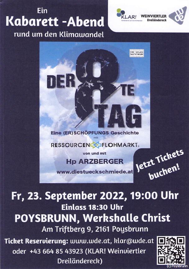 Klima-Kabarett Freitag, 23. September 2022, 19:00 Uhr Werkshalle Christ Am Triftberg 2161 Poysbrunn Einlass/Resourcenflohmarkt: 18:15 Uhr ... mehr Infos ...