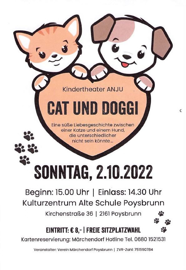 "CAT UND DOGGI" Sonntag, 2. Oktober 2022, 15:00 Uhr Kulturzentrum Alte Schule Poysbrunn Kirchenstraße 36, 2161 Poysbrunn Einlass: 14:30 Uhr Märchendorf Poysbrunn ... mehr Infos ...