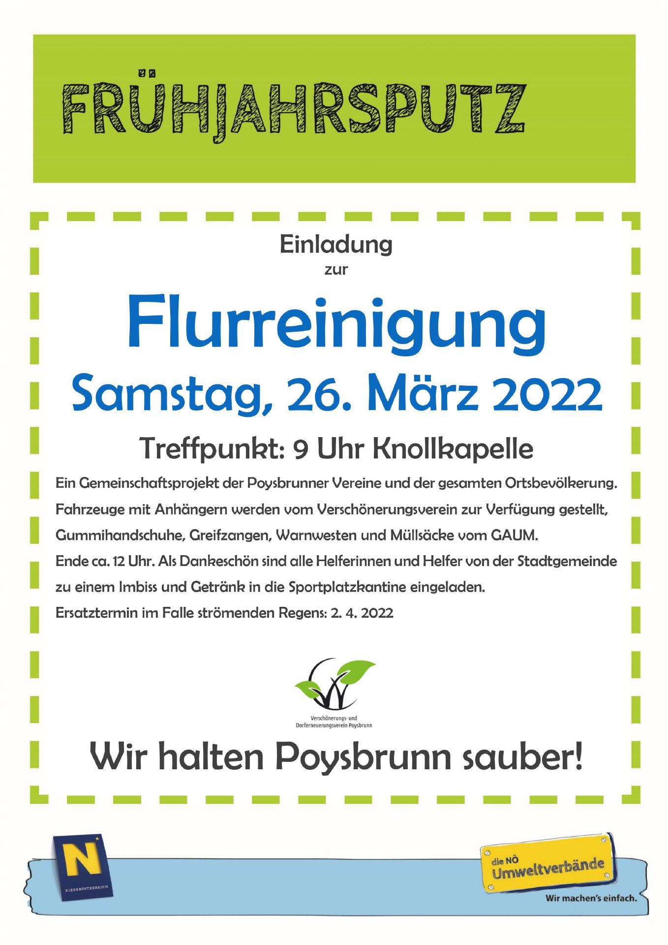 Verschönerungs- und Dorferneuerungsverein Poysbrunn Einladung zur Flurreinigung am Samstag, den 26. März 2022 (Ersatzterming: Samstag, 2. April 2022) Treffpunkt: 9:00 Uhr Knollkapelle ... mehr Informationen ...