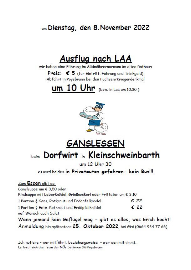 Ausflug nach Laa an der Thaya Dienstag 8. November 2022 10:30 Uhr: Führung Südmährermuseum im Alten Rathaus 12:30 Uhr: Ganslessen beim Dorfwirt in Kleinwscheinbarth Anmeldung bis spätestens 25. Oktober 2022 ... für mehr Infos hier klicken ...