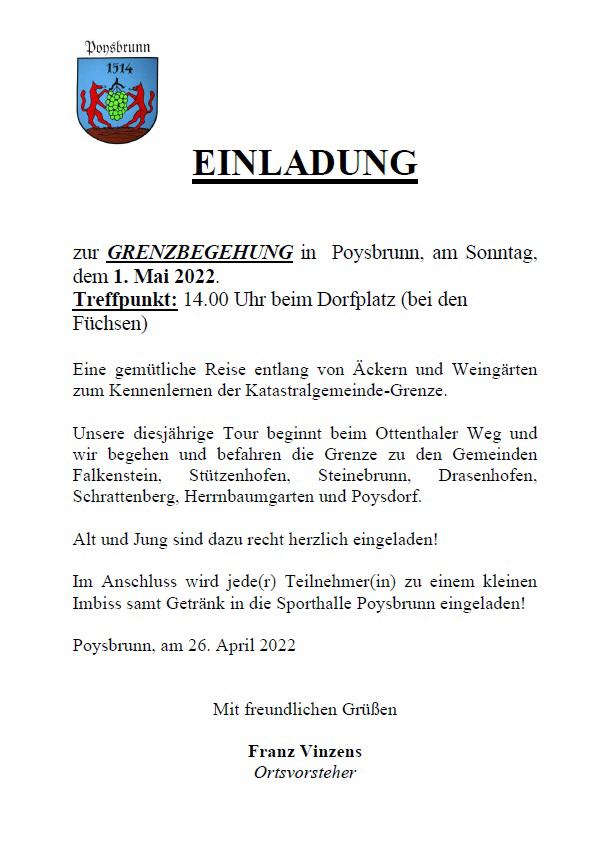 Jahreshauptversammlung und Neuwahlen Am 18.02.2022 wurde in Poysbrunn im Kulturzentrum "Alte Schule" die Jahreshauptversammlung des Verschönerungs- und Dorferneuerungsvereines Poysbrunn abgehalten. Da unser bisheriger Obmann Franz Kapusta im Vorjahr verstorben ist, mussten wir den Vorstand neu wählen. Als Obmann wurde Erwin Christ, der bisher das Amt des Stellvertreters ausübte neu gewählt. ... mehr Informationen ...