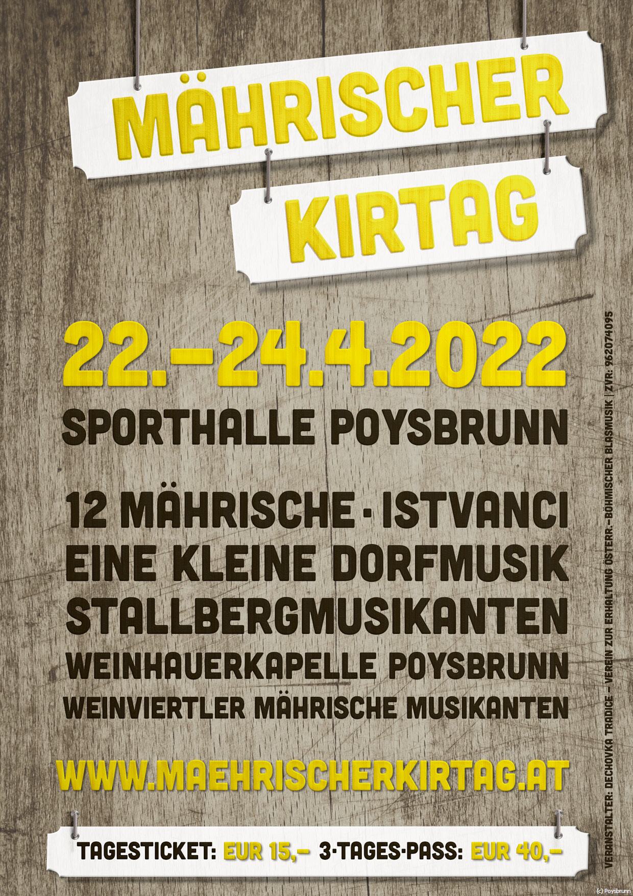 Weinviertler Mährische Musikanten Freitag, 22. April 2022 Samstag, 23. April 2022 Sonntag, 24. April 2022 Sporthalle Poysbrunn ... zum Mährischen Kirtag 2022 ... ... zum Plakat ...