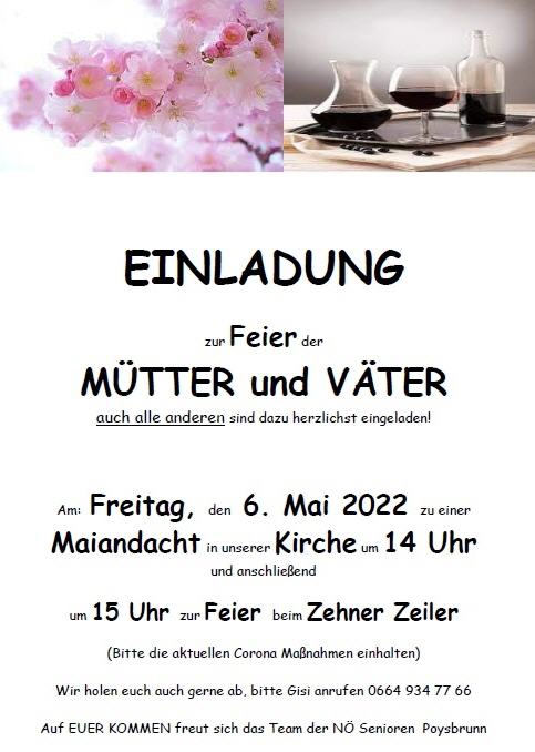 Einladung zur Feier der MÜTTER und VÄTER (auch alle anderen sind dazu herzlichst eingeladen!) am Freitag, den 6. Mai 2022 14:00 Uhr: Maiandacht in unserer Kirche und anschließend 15:00 Uhr: Feier beim Zehner Zeiler Bitte die aktuellen Corona Maßnahmen einhalten! Wir holen euch auch gerne ab, bitte Gisi anrufen 0664 934 77 66 Auf EUER KOMMEN freut sich das Team des Seniorenbundes Poysbrunn!!!
