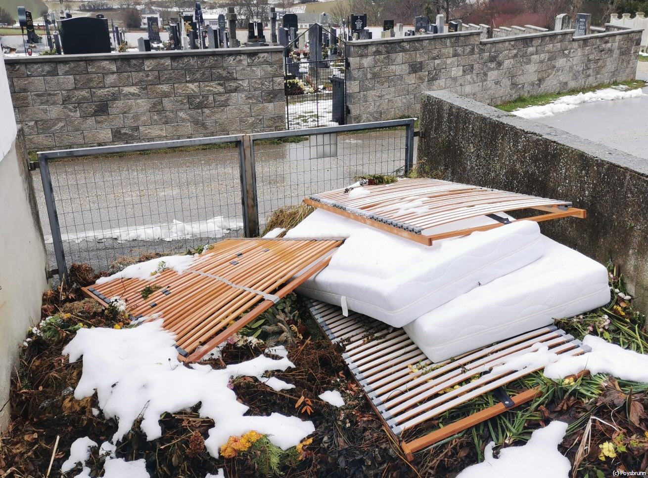 Was ist denn das für eine Sauerei? Auf der Grünschnittdeponie beim Friedhof in Poysbrunn wurden am vergangenen Wochenende Matratzen und Lattenroste und dgl. entsorgt! Diese wilden Ablagerungen wurden selbstverständlich zur Anzeige gebracht! Falls Sie etwas gesehen oder gehört haben, ersuchen wir um sachdienstliche Hinweise entweder an ihre Gemeindevertreter, an die Gemeinde oder an die Polizei Poysdorf! Mit freundlichen Grüßen Franz Vinzens Ortsvorsteher