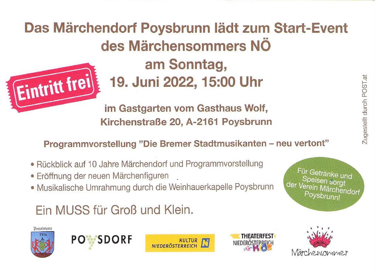 Märchendorf Poysbrunn Märchensommer NÖ START-EVENT 2022 Sonntag, 19. Juni 2022 15:00 Uhr Gastgarten Gasthaus Wolf Kirchtstraße 20, 2161 Poysbrunn ... mehr Informationen ...