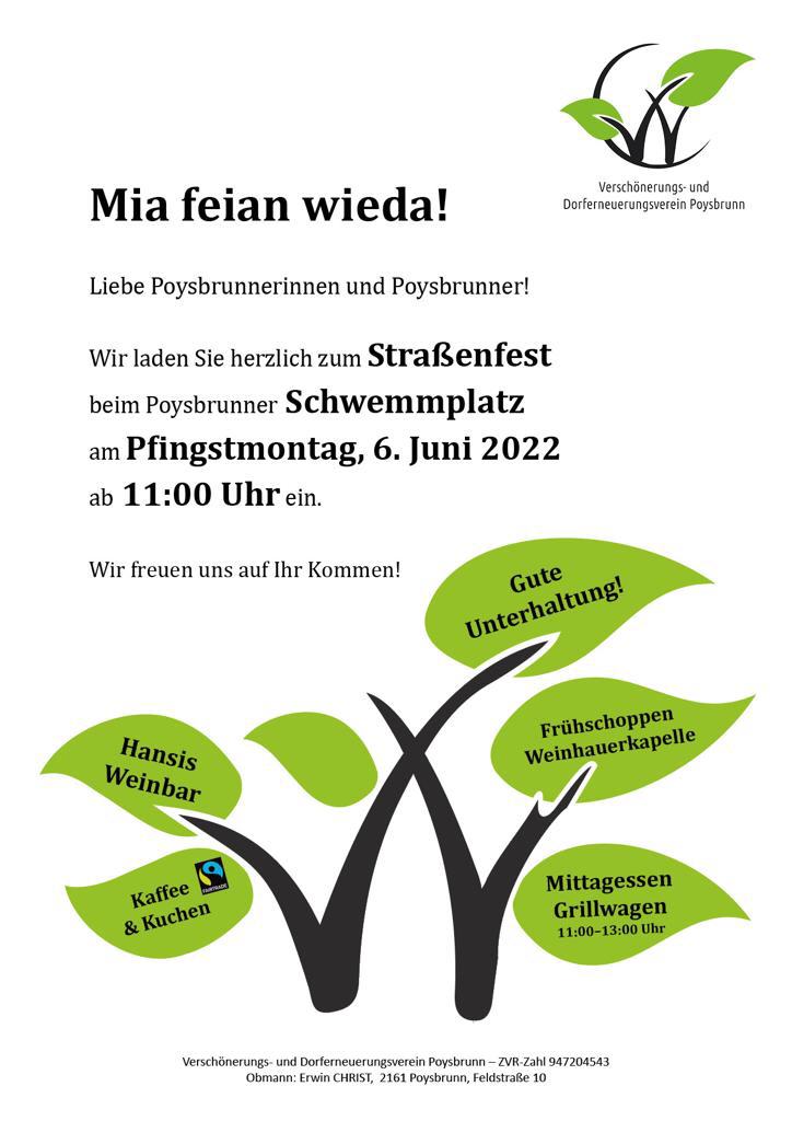 Verschönerungs- und Dorferneuerungsverein Poysbrunn Straßenfest beim Poysbrunner Schwemmplatz Pfingstmontag 6. Juni 2022 ab 11:00 Uhr ⚠️ !!! ACHTUNG !!! ⚠️⚠️ !!! ACHTUNG !!! ⚠️ Das Straßenfest findetwitterungsbedingt in der CHRISTHALLE am Triftberg statt !!! ⚠️ !!! ACHTUNG !!! ⚠️⚠️ !!! ACHTUNG !!! ⚠️ Das erwartet Sie ...